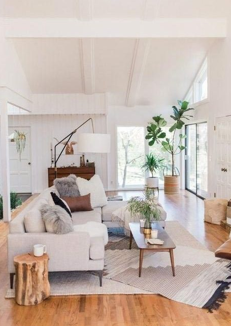 Soft, curved and organic shapes and lines prominently feature such as rounded furniture, baskets, plant pots and light pendants to soften the space and create a relaxed atmosphere. These are reinforced with rectilinear shapes and simple, clean lines predominantly seen in main furniture items like low profile sofas and bedframes, wall art and architectural structures such as large-scale windows, skylights, ceiling beams, walls and flooring. This balance between both curved and straight lines reinforces stability and balance within the interior.