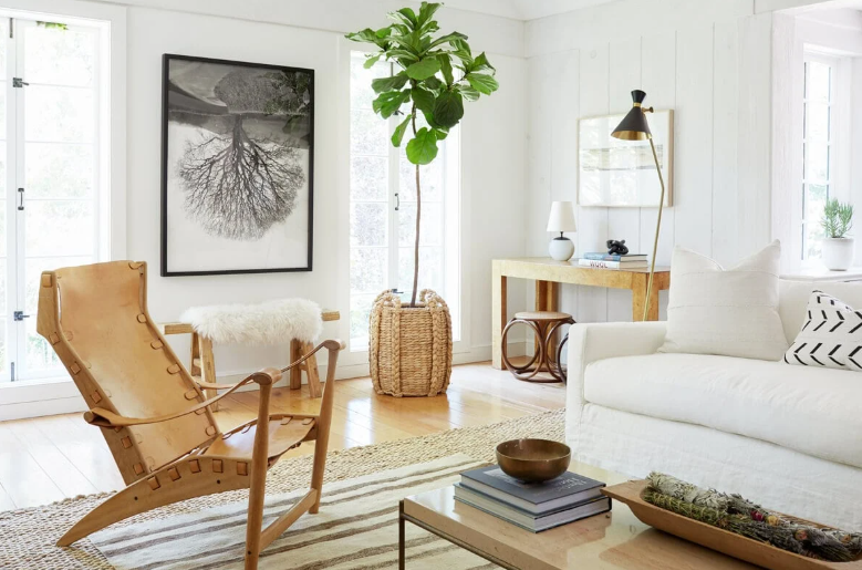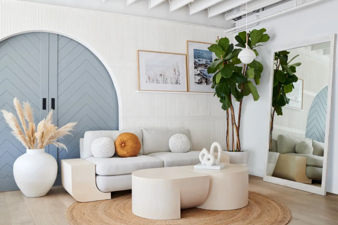 Emphasis in Californian Cool interiors is placed on connection to the outdoors and nature to bring about a relaxing, breathable and grounding feeling. This is achieved through large scale windows, sliding glass doors, skylights, sheer curtains and minimal window treatments, creating a seamless transition between the indoors and outdoors and allow natural light to flood the space. Incorporation of organic materials as well as biophilic design both indoors and outdoors strengthens the visual continuity between the two environments and makes the space feel expansive.